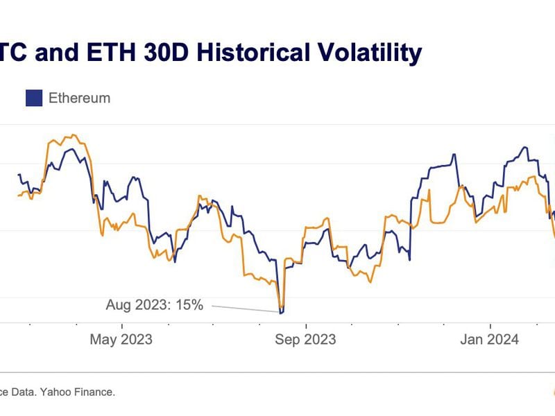 Bitcoin’s annualized 30-day historical or realized volatility rose to nearly 60% late last week, surpassing ether’s 30-day realized volatility by nearly 10 percentage points. Bitcoin’s annualized 30-day historical or realized volatility rose to nearly 60% late last week, surpassing ether’s 30-day realized volatility by nearly 10 percentage points.