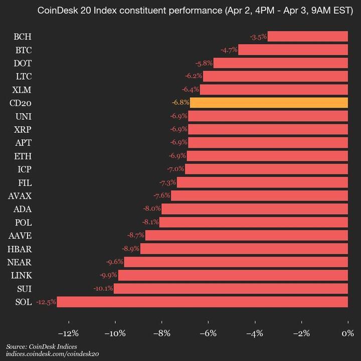 CoinDesk Indices presents its daily market update, highlighting the performance of leaders and laggards in the CoinDesk 20 Index.