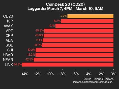CoinDesk Indices presents its daily market update, highlighting the performance of leaders and laggards in the CoinDesk 20 Index.