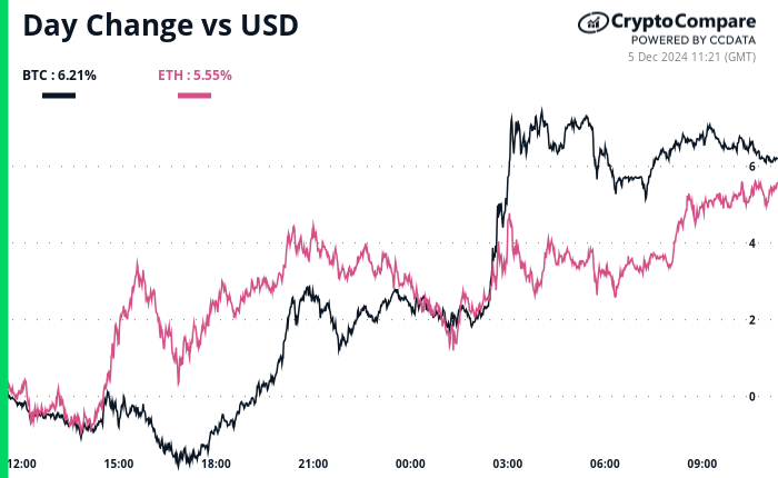 Crypto-related equities jumped before the U.S. market open after bitcoin (BTC) broke through the $100,000 psychological barrier, adding 4% in 24 hours.