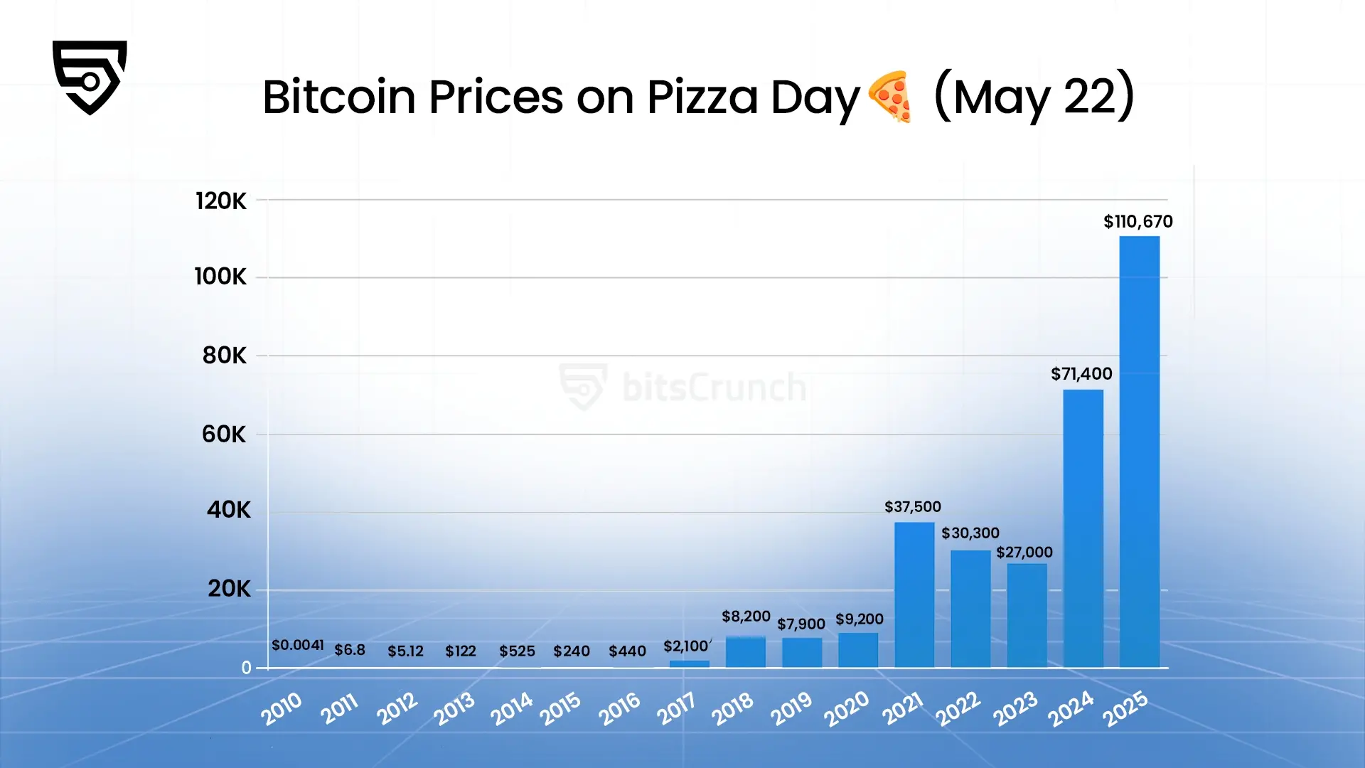 从0.0041美元到15年后的11万美元,通过梳理历年5月22日的比特币价格数据,根据 bitsCrunch.com 数据,可以清晰捕捉其发展轨迹中的关键周期与驱动逻辑。下图是比特币在历年披萨节的价格表现。