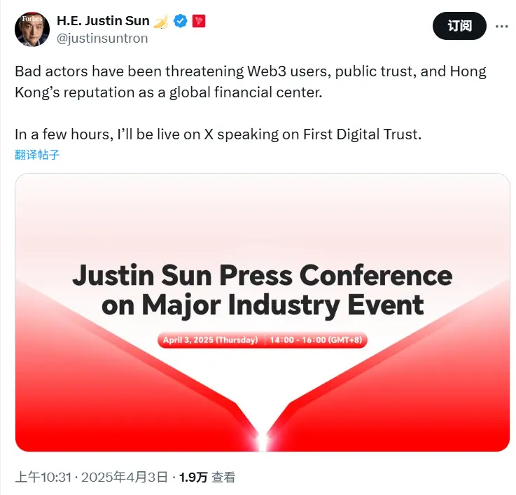 8V加密货币学院 » 孙宇晨:将在几小时内就 First Digital Trust 事件进行直播