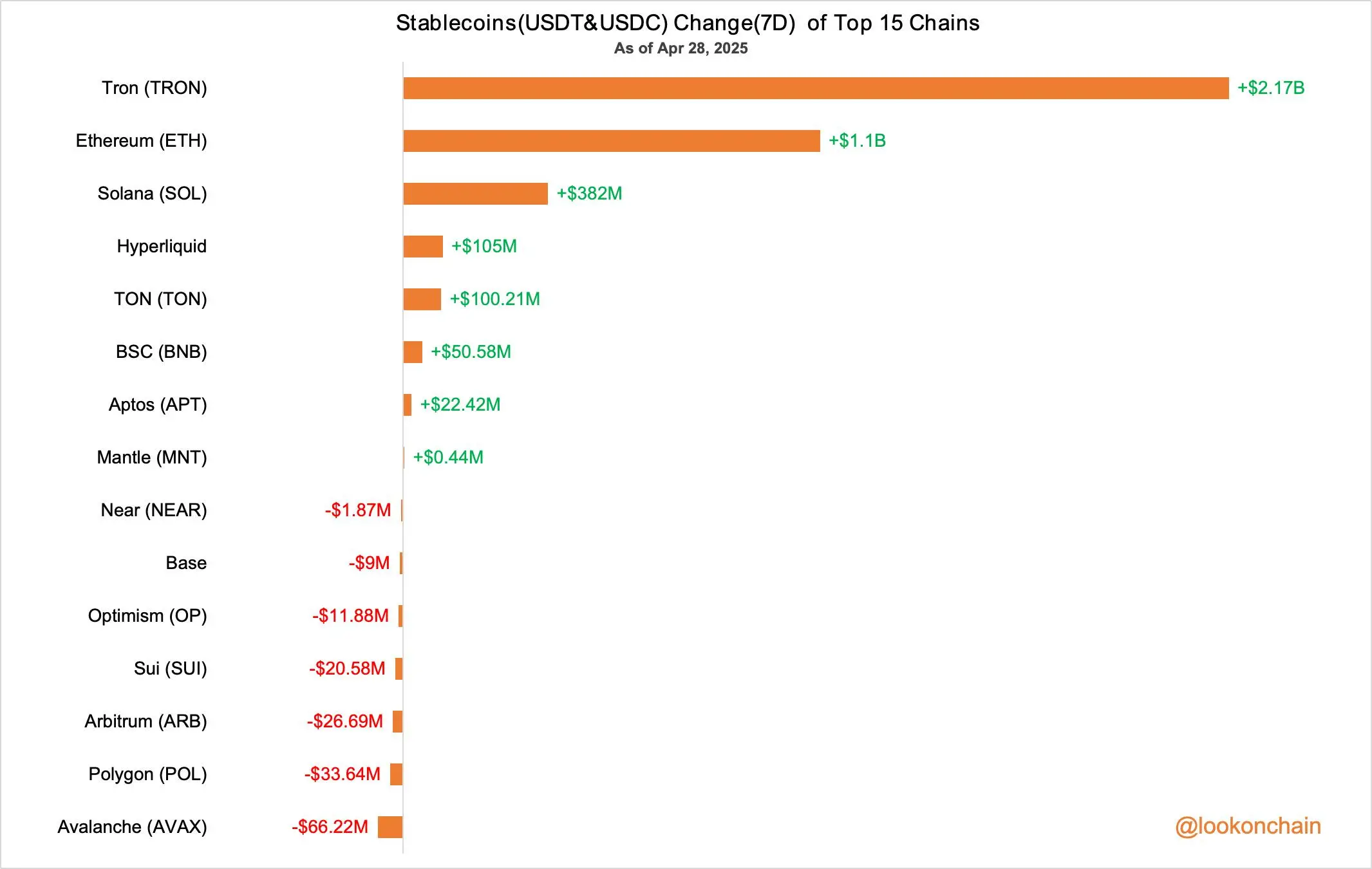 ChainCatcher 消息,据 Lookonchain,过去 7 天内 Tron 链上的 USDT 与 USDC 稳定币净增 21.7 亿美元,而 Avalanche 链上的稳定币则减少约 6622 万美元。