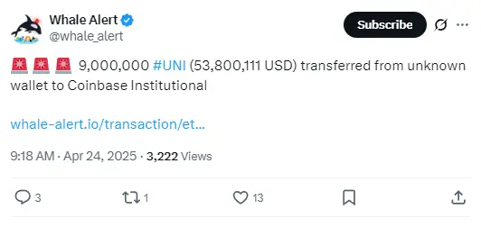 ChainCatcher 消息,据 Whale Alert 监测,北京时间上午 9:18 左右,9,000,000枚 UNI(53,800,111 美元)从未知钱包转入 Coinbase Institutional。