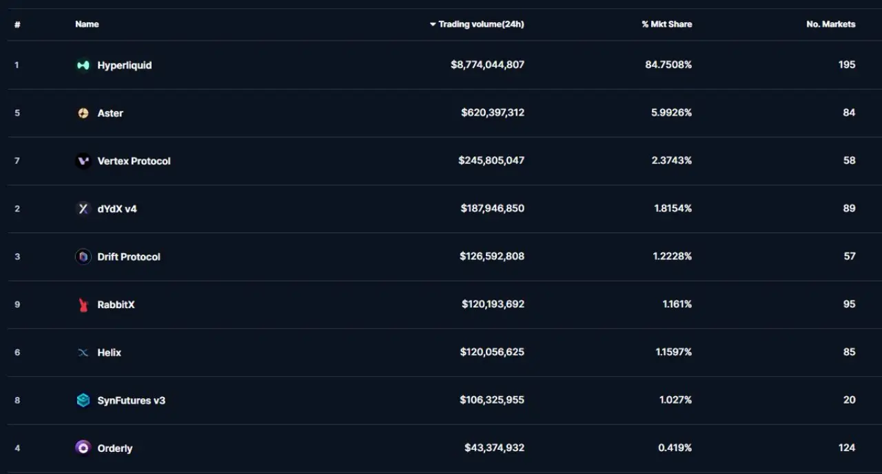 近日,Aster的Perp DEX排名一度攀升至第二,紧跟Hperliquid其后。