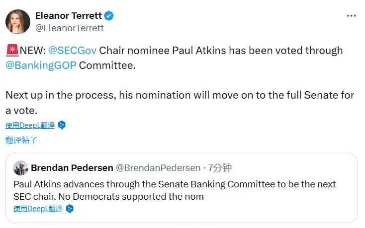 ChainCatcher 消息,加密记者 Eleanor Terrett 在 X 平台发文称,美 SEC 主席提名人 Paul Atkins 已通过参议院银行委员会投票,接下来,他的提名将提交参议院全体会议投票。