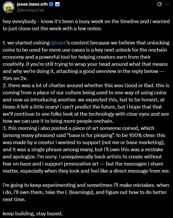 ChainCatcher 消息,Base 协议负责人 Jesse Pollak 此前在 X 平台发布了包含“Base is for (不雅词汇)”的推文,随后引发社区不满,为此他发文承认错误并为此道歉。