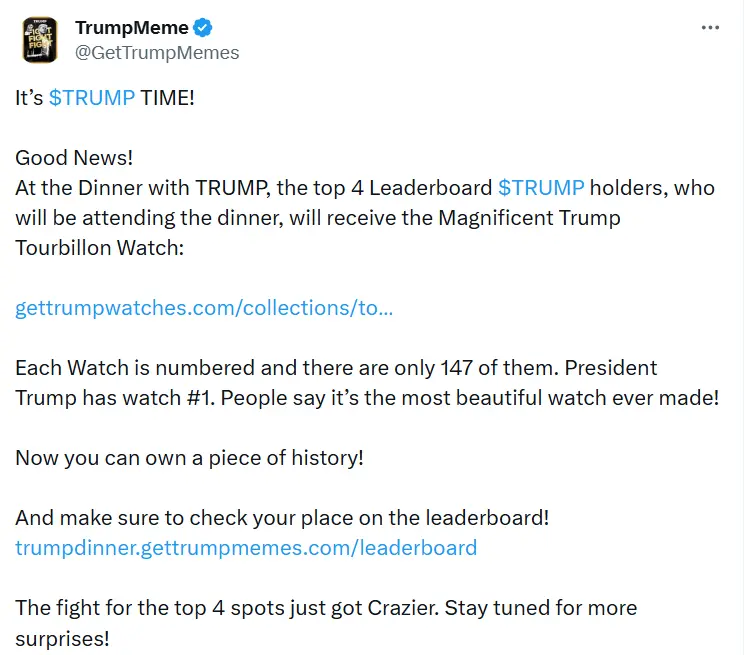 ChainCatcher 消息,据官方消息,排行榜前四名的 TRUMP 持币者在出席特朗普晚宴时将获赠限量版特朗普陀飞轮腕表。该腕表全球仅发行 147 枚,每枚均带有独立编号,其中 1 号腕表由特朗普本人持有。