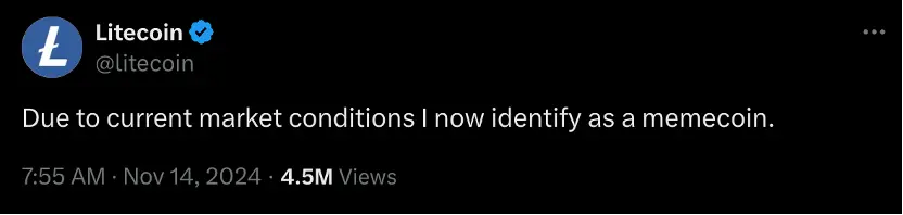 北京时间 11 月 14 日早晨,已经淡出市场视野很久的莱特币 Litecoin 突然发布了这样一条官推: