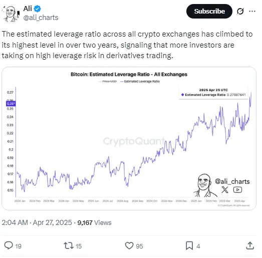 ChainCatcher 消息,加密分析师 @ali_charts 发布图表分析称,所有加密货币交易平台的整体预估杠杆率已升至两年多来的新高,表明越来越多投资者在衍生品交易中承担高杠杆风险。