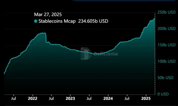 首先是关于稳定币与 BTC 价格变化的分离原因,这次周期的新增资金并未直接大范围流入 BTC 现货市场。数据显示,2025 年 3 月衍生品未平仓合约仍维持在 540 亿美元高位,而交易所的现货稳定币净流入相对疲软。这意味着大量稳定币被用于杠杆交易(如期货、永续合约),而非实际持币需求,甚至更多的成为了一种对冲手段。