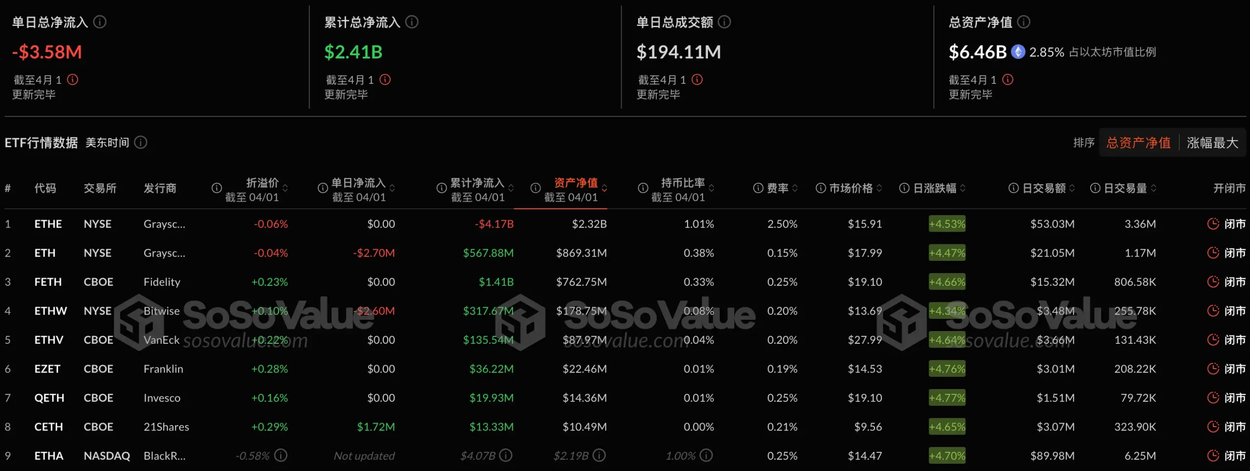ChainCatcher 消息,根据 SoSoValue 数据,昨日(美东时间 4 月 1 日)以太坊现货 ETF 总净流出 358.25 万美元。