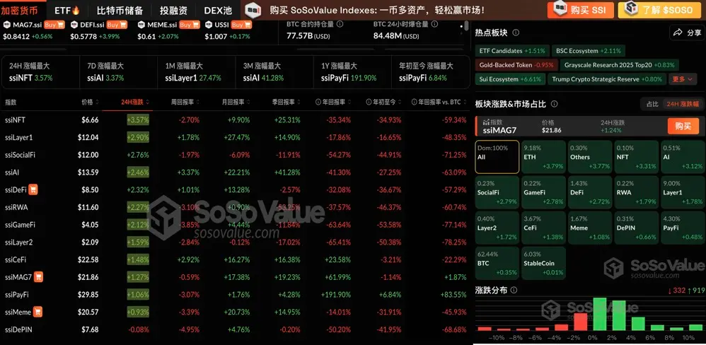 反映板块历史行情的加密板块指数显示,ssiNFT、ssiLayer1、ssiSocialFi 指数 24 小时分别上涨 3.57%、2.90%、2.76%