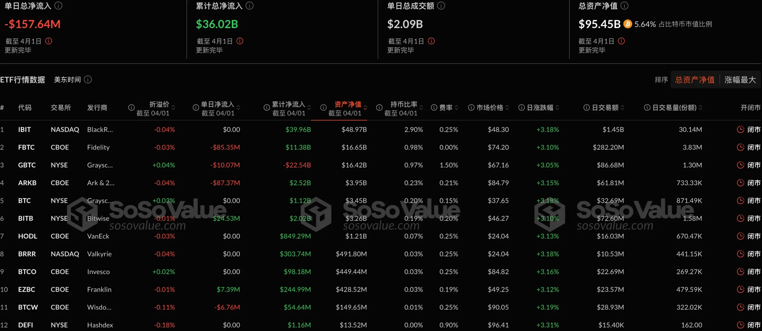 ChainCatcher 消息,根据 SoSoValue 数据,昨日(美东时间 4 月 1 日)比特币现货 ETF 总净流出 1.58 亿美元。