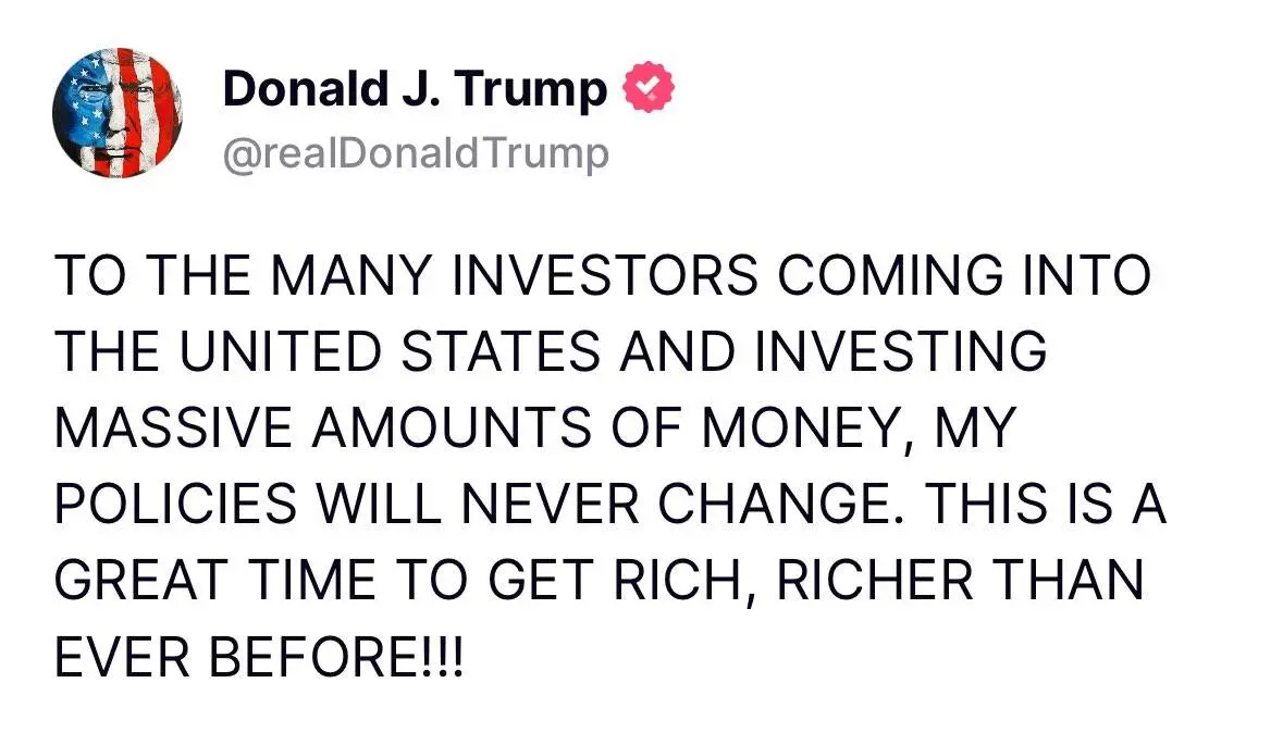 ChainCatcher 消息,特朗普在其社交媒体账号发文表示:“致所有正在涌入美国并投入巨额资金的投资者们,我的政策永远不会改变。这是一个致富的好时机,比以往任何时候都能赚得更多!!!”