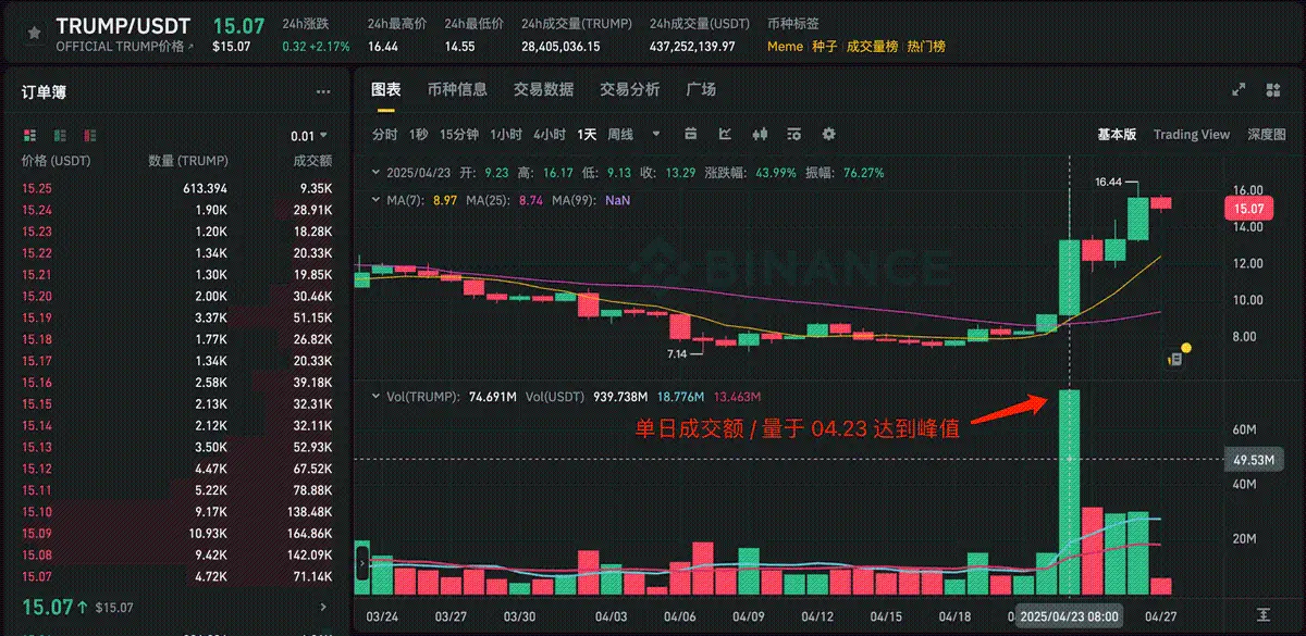 ChainCatcher 消息,据 @ai_9684xtpa 监测,自特朗普 TRUMP 晚宴计划宣布以来,九日内 TRUMP 代币表现亮眼:Binance 现货交易量增长 202%,单日交易额高达 9.4 亿美元;现货与合约 24 小时成交额达 27.82 亿美元,跻身 TOP3;DEX 成交额达 4.89 亿美元,TRUMP 币价累计上涨 94.6%,振幅达 112%。