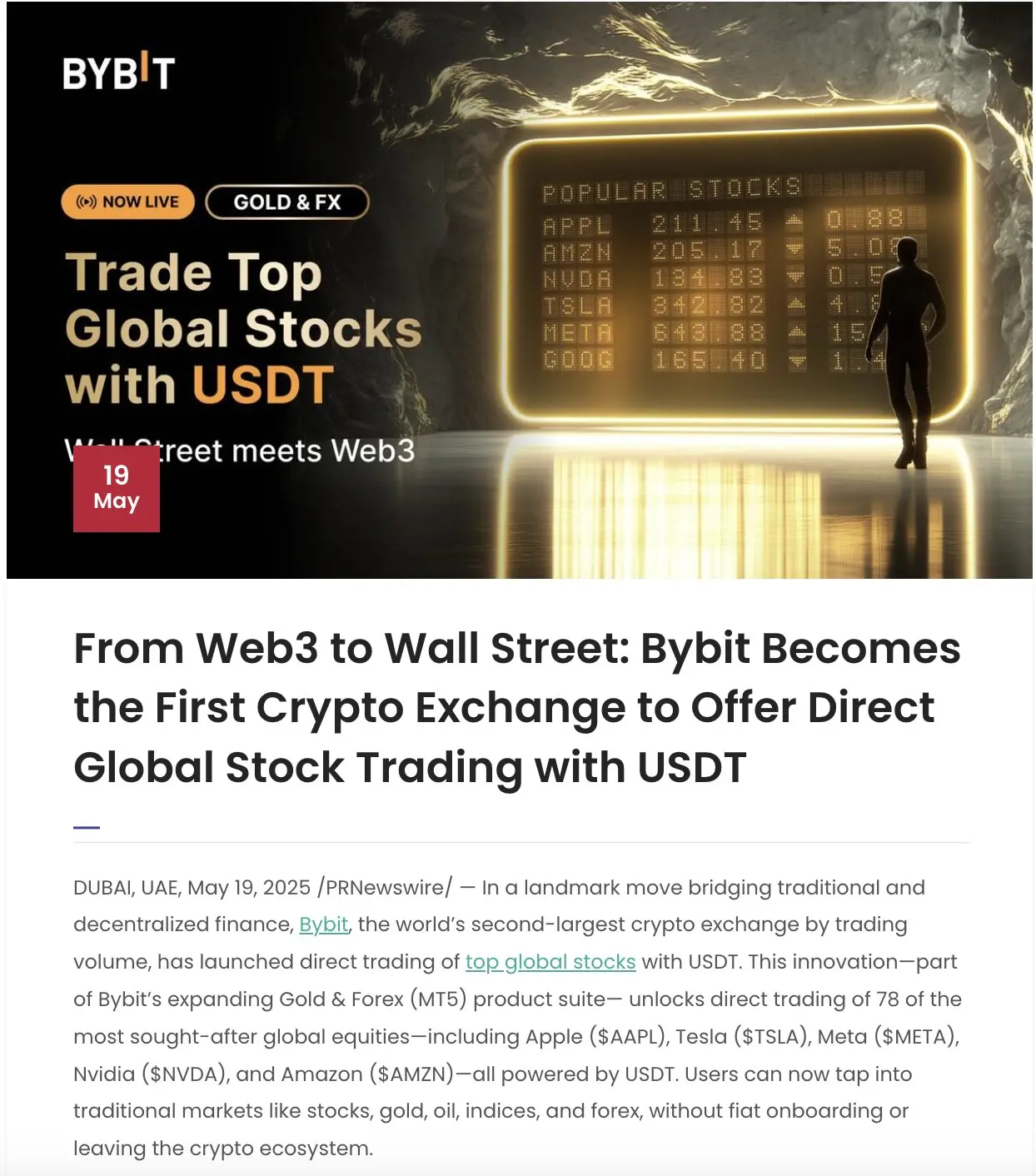5月19日,Bybit 宣布成为首家支持使用 USDT 直接交易全球股票的主要加密货币交易所。