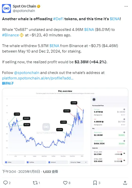 ChainCatcher 消息,据 Spot On Chain 监测,一巨鲸于 40 分钟前解质押并向币安存入 496 万枚 ENA,价值约 601 万美元。在 2024 年 5 月 10 日至 12 月 2 日期间,该巨鲸以约 0.75 美元(约 446 万美元)的价格从币安转出 597 万枚 ENA 用于质押。若全部出售,可实现利润 238 万美元。