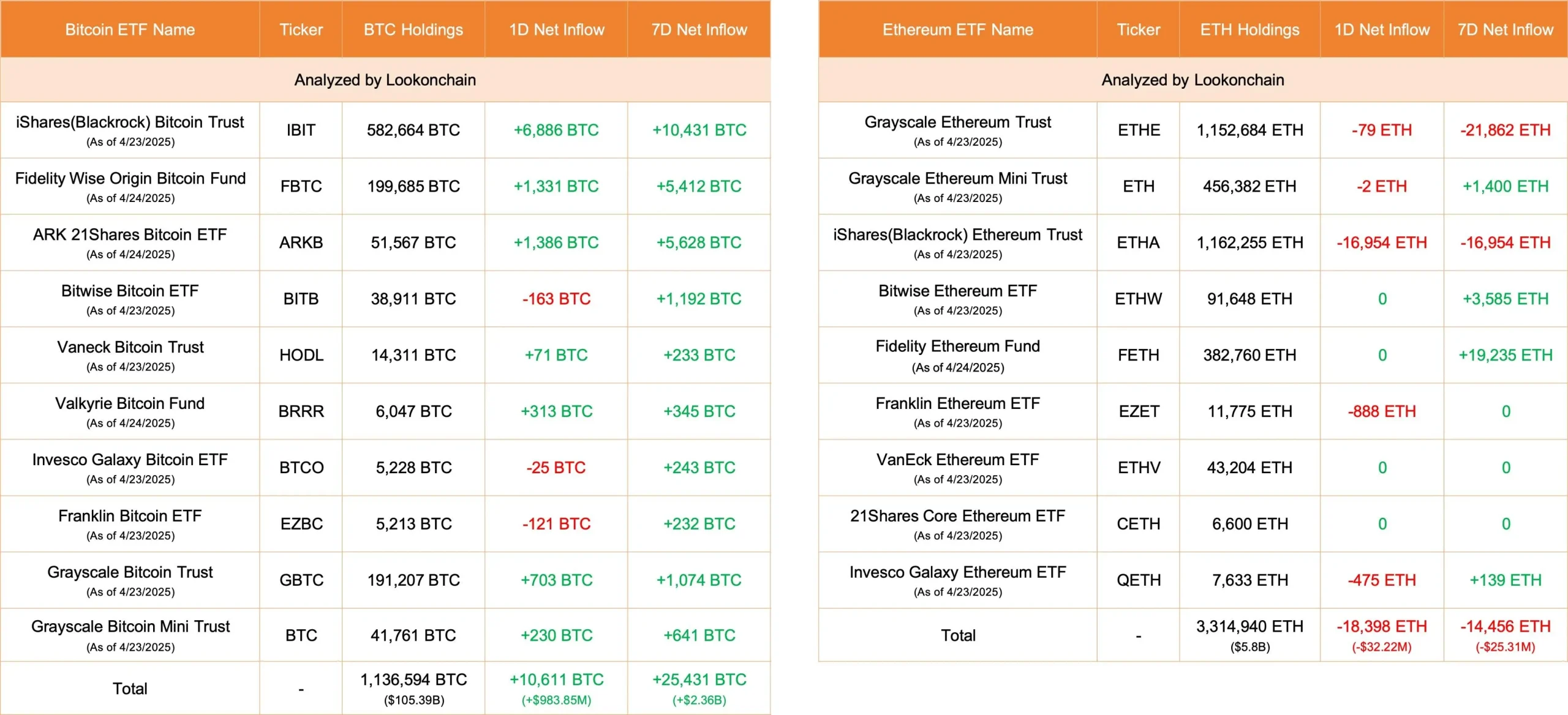 其他 数据:今日美国比特币 ETF 净流入 10,611 枚 BTC,以太坊 ETF 净流出 18,398 枚 ETH by 8V 24 4 月, 2025 0 ChainCatcher 消息,据 Lo... Read moreDetails