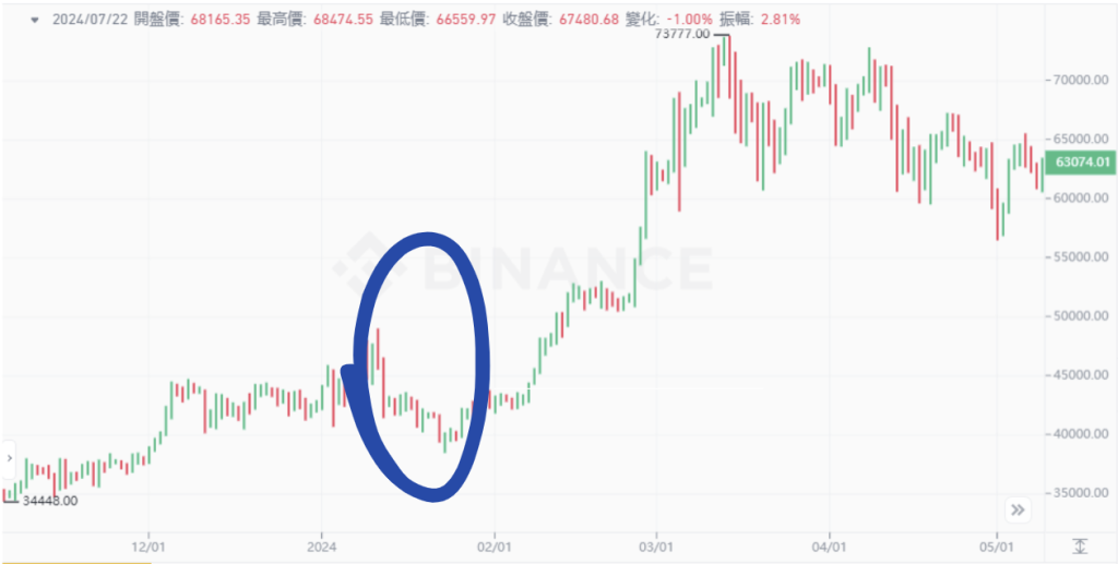比特幣在 1 月 11 日喜迎現貨 ETF 首次上市交易後,由 48K 一路下跌到 1/23 的 38K,之後才開啟反彈走勢,其後一路走升創下歷史新高 73,777 美元。