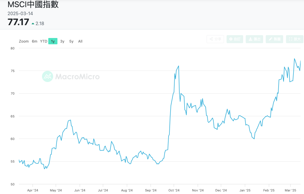 中國在去年九月推出疫情以來最大的經濟刺激方案,中國股市一度大漲,散戶開戶數大增,MSCI 中國指數由 54 一路飆升至 76,但之後再度陷入了近半年的整理。