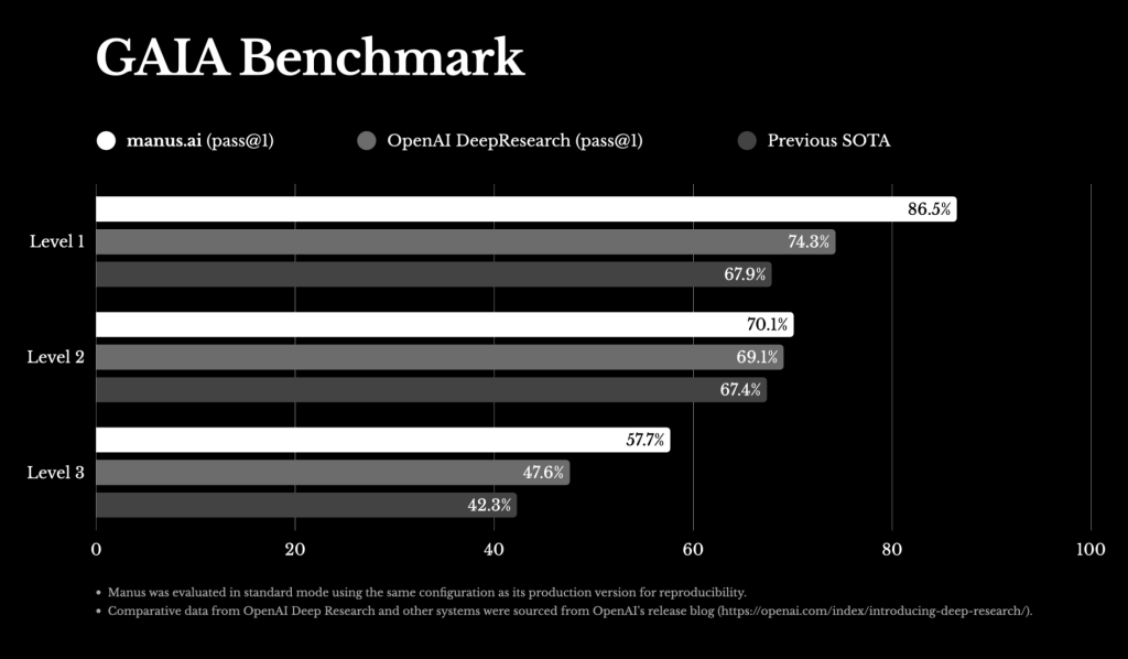 Manus 提出 GAIA Benchmark 評等數據基準, 欲證明 Manus 在三個 AI 代理解決問題難度級別上都超越 OpenAI 。但 Manus 的技術原創性也受到質疑,產品為基於現有的開源大型語言模型 (LLM) 套殼而成,像是舊瓶裝新酒。