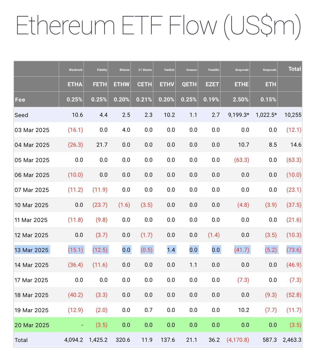 與此同時,根據 Farside Investors 的數據,以太坊相關的 ETF 已經連續 11 天出現資金淨流出,最慘的一天是 2025 年 3 月 13 日,當天有高達 7,360 萬美元的資金從以太坊 ETF 撤出。