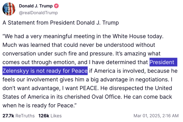 會面結束後不久,川普隨即在 Truth Social 發文,指控澤連斯基在美國參與談判的情況下,並不真正尋求和平。