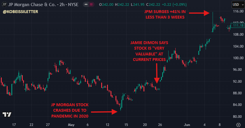 過去,Dimon 的交易行為被視為市場走勢的重要指標。2020 年 5 月,當市場因疫情陷入低谷時,他在 CNBC 受訪時表示 $JPM「極具價值」,結果三週內股價飆升 41%,這個時機點後來被稱為「戴蒙底部 (Dimon Bottom)」。