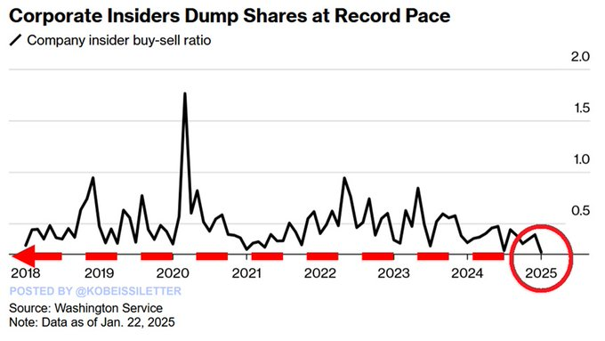 不僅是戴蒙與巴菲特,企業高層的內部交易趨勢也反映了市場的不安情緒。2 月初,內部買賣比率降至 0.22,為 1988 年以來最低,顯示公司高層更傾向減持股票,而非增持。
