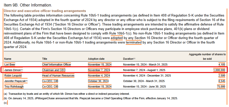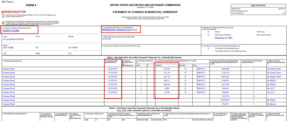 2 月 20 日,Jamie Dimon 透過家族信託及有限責任公司等實體,拋售約 866,361 股摩根大通 ($JPM) 股票,平均價格約每股 269.83 美元,總額達 2.34 億美元。這是他自 19 年前接掌摩根大通以來首次大規模地出售股票。