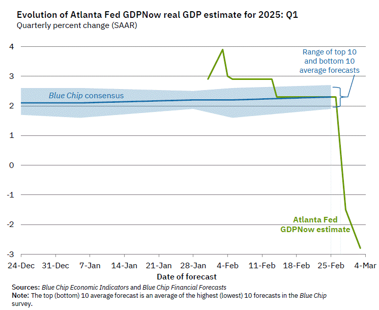 亞特蘭大聯邦儲備銀行的 GDPNow 模型顯示,美國 2025 年第一季度 GDP 預測在短短四週內從 +3.9% 降至 -2.8%,引發市場對美國經濟前景的擔憂。