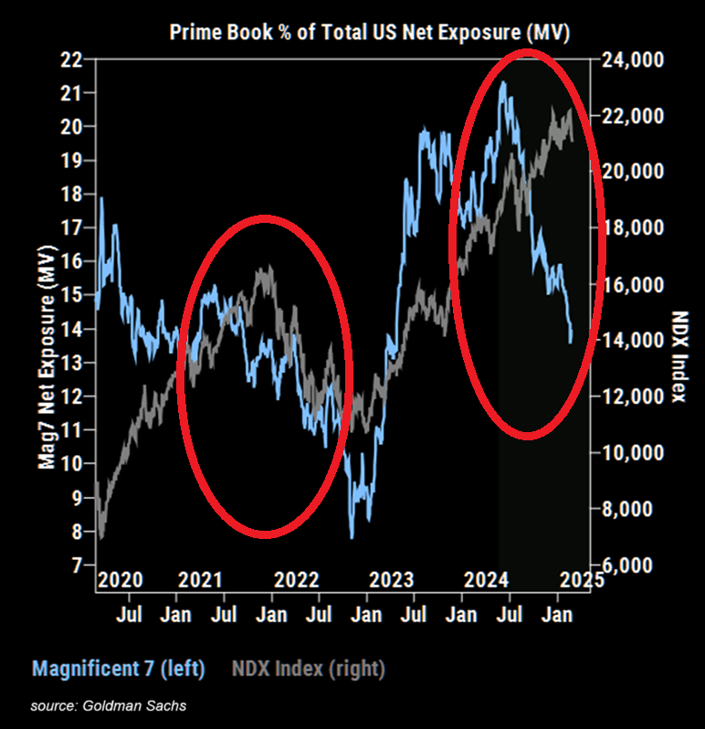 同時,對沖基金對美國科技股的持倉降至 22 個月低點,尤其是對美股七雄 (Magnificent 7) 的大規模減持,顯示市場對風險資產的信心正在下滑。