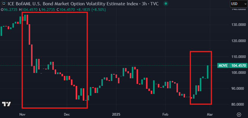 債券市場也難逃波動,美債波動率 (MOVE) 從去年 11 月至 12 月下跌了 40%。然而在過去 7 個交易日中,該指數已大幅上漲 25%。種種跡象表明,投資者對未來的不確定性感到極度不安。