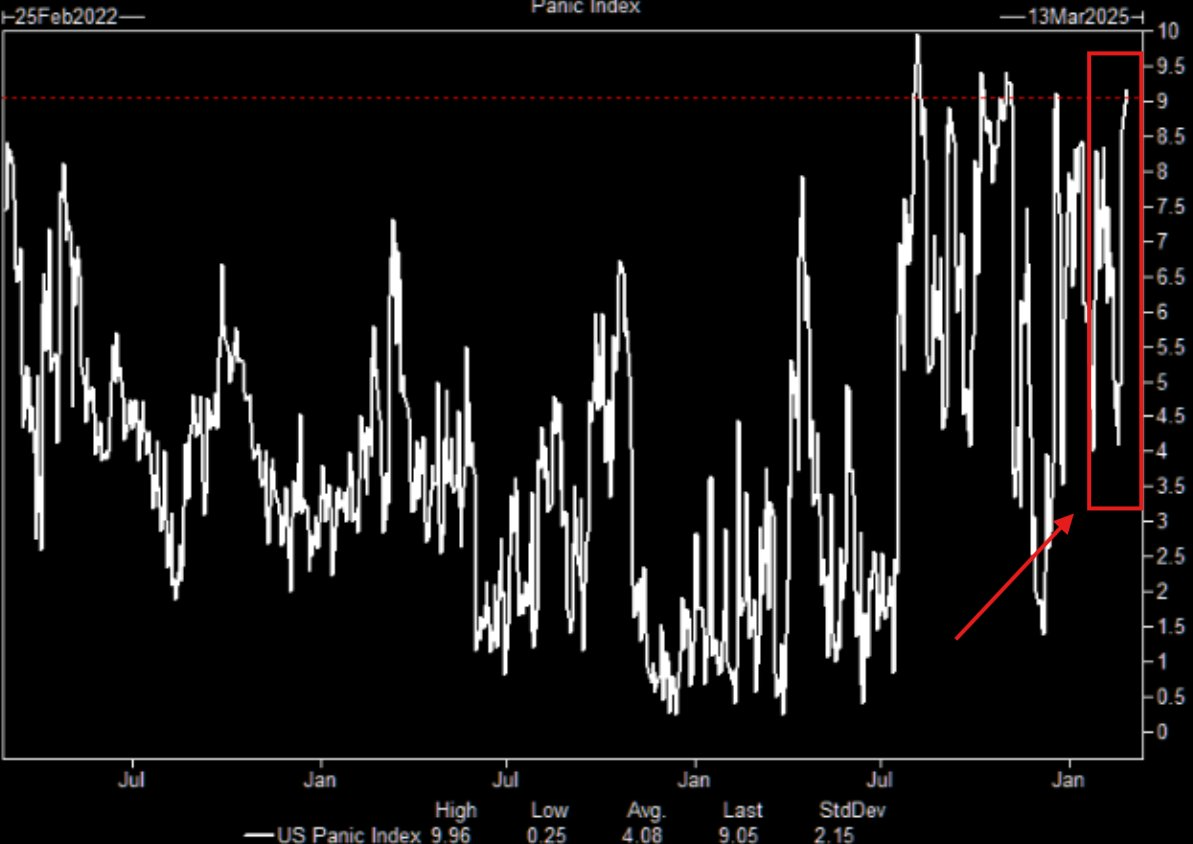 高盛的恐慌指數 (Panic Index) 更自去年 12 月的 1.4 飆升至 9.1,達到罕見歷史高位,顯示市場壓力處於異常水準。