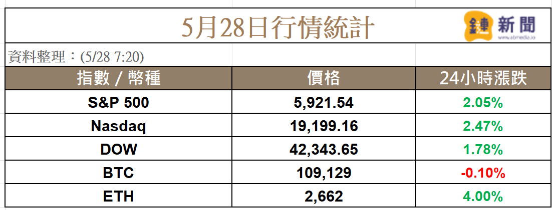 受美國消費者信心反彈、貿易談判加速以及全球債券市場飆升等因素提振,美股全面上揚。比特幣持續在 108K~110K 區間徘徊,根據 SoSoValue 的資料,美國比特幣 ETF 連續 8 日呈現淨流入,貝萊德的 IBIT 淨資產已達 714 億美元,佔比特幣總市值的 3.32%。