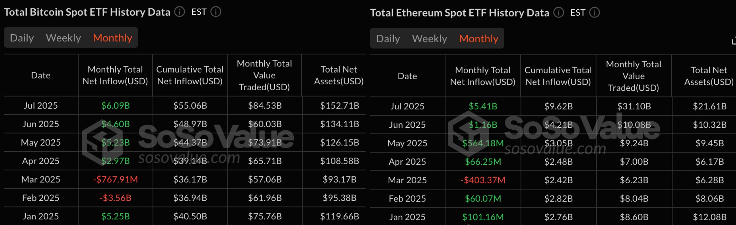 7 月政策利好,比特幣與以太幣 ETF 淨流入皆創新高