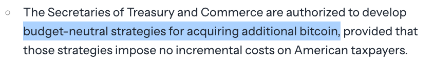 根據行政命令,所有存入戰略比特幣儲備的比特幣將不會被出售,而是作為國家儲備資產長期持有。此外,財政部和商務部負責制定預算中立的策略,以獲取額外比特幣,前提是這些策略不會對美國納稅人產生額外成本。