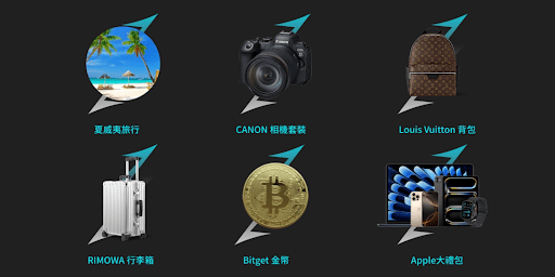 - 交易量獎池(最高 154,000 USDT):交易量達標即可爭奪獎勵,前五名更有機會獲得夏威夷全家遊、CANON 單眼相機、Apple 禮包、LV 背包等豐富實物大獎。