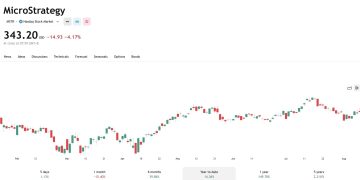 MSTR 股價近期走勢疲弱,昨日宣布買幣後仍下跌 4.17%,收在 343.2 美元。今年迄今股價僅上漲 14%,已輸給比特幣的 17%。
