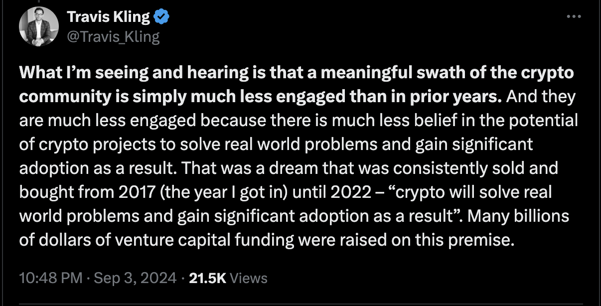 Kling 認為,累積點數換取加密貨幣空投的行銷策略已失敗,迷因幣的狂熱更是讓人尷尬和荒唐。長期投入加密貨幣的人逐漸意識到,產業表面看似進展,但實際成果並不成比例。對於多年投入大量精力的參與者來說,這是巨大的打擊。