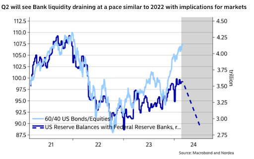 Nikolaos Panigirtzoglou 進一步解釋說:「隨著這兩個關鍵因素可能已經結束,聯準會的持續量化緊縮 (QT) 以及美國銀行貸款的緩慢增長,可能導致美國的流動性和 M2 貨幣供應量再次收縮,可能會與 2022 年的情況相似。」